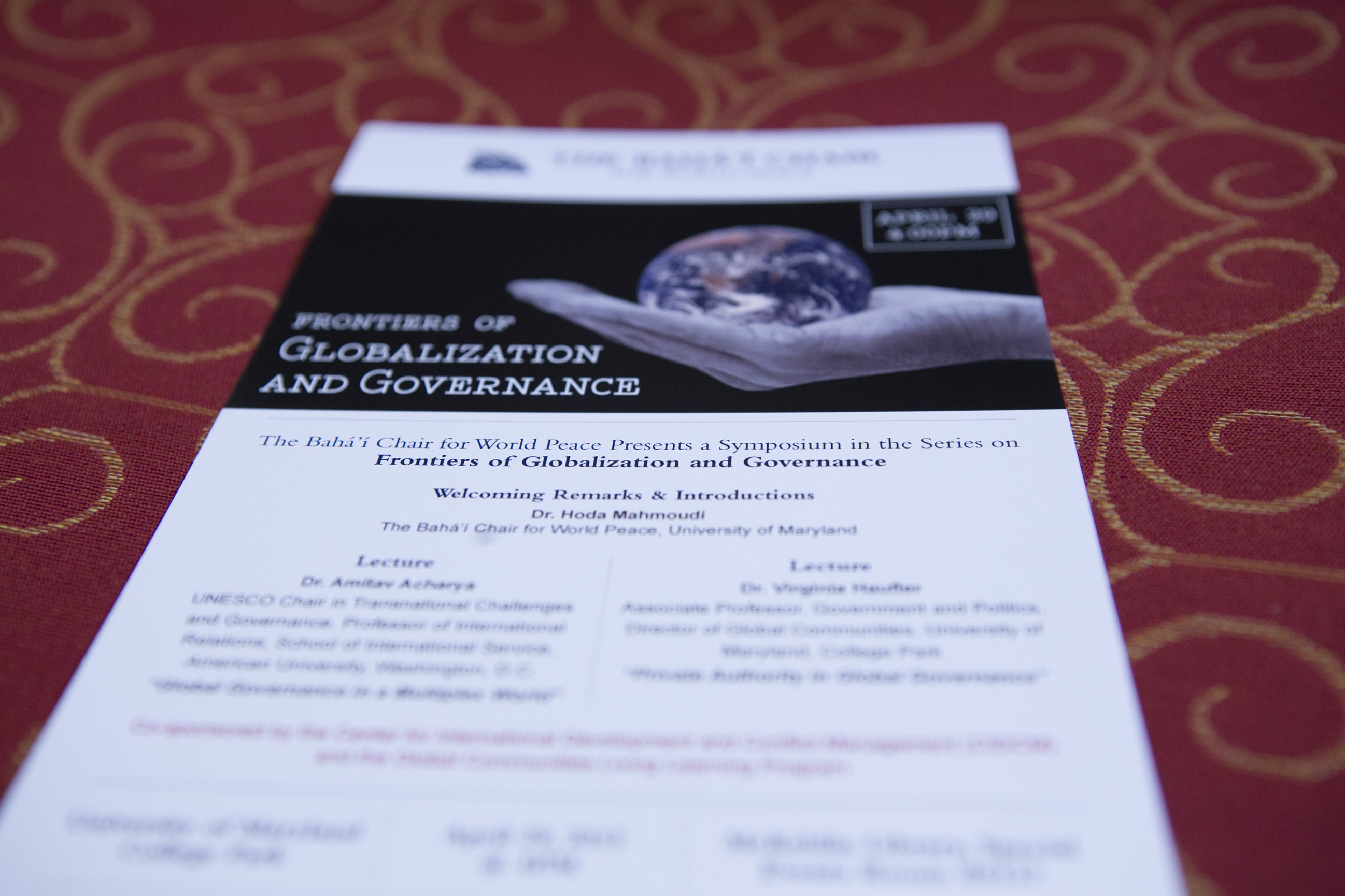 University of Maryland, College Park, 2015: Part of the lecture series “Frontiers of Globalization and Governance” in the 2015 Bahá’í Chair for World Peace Spring Symposium.